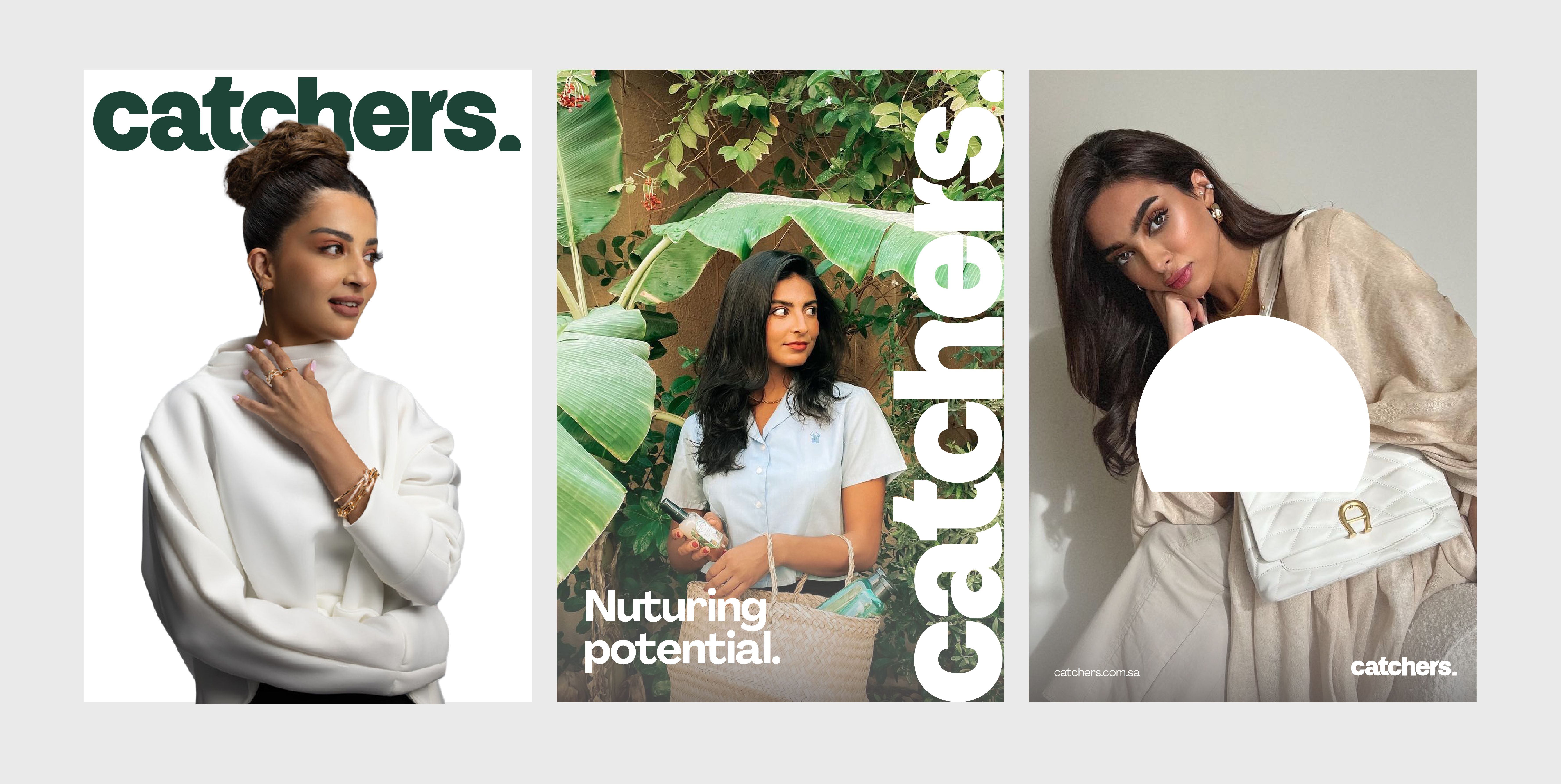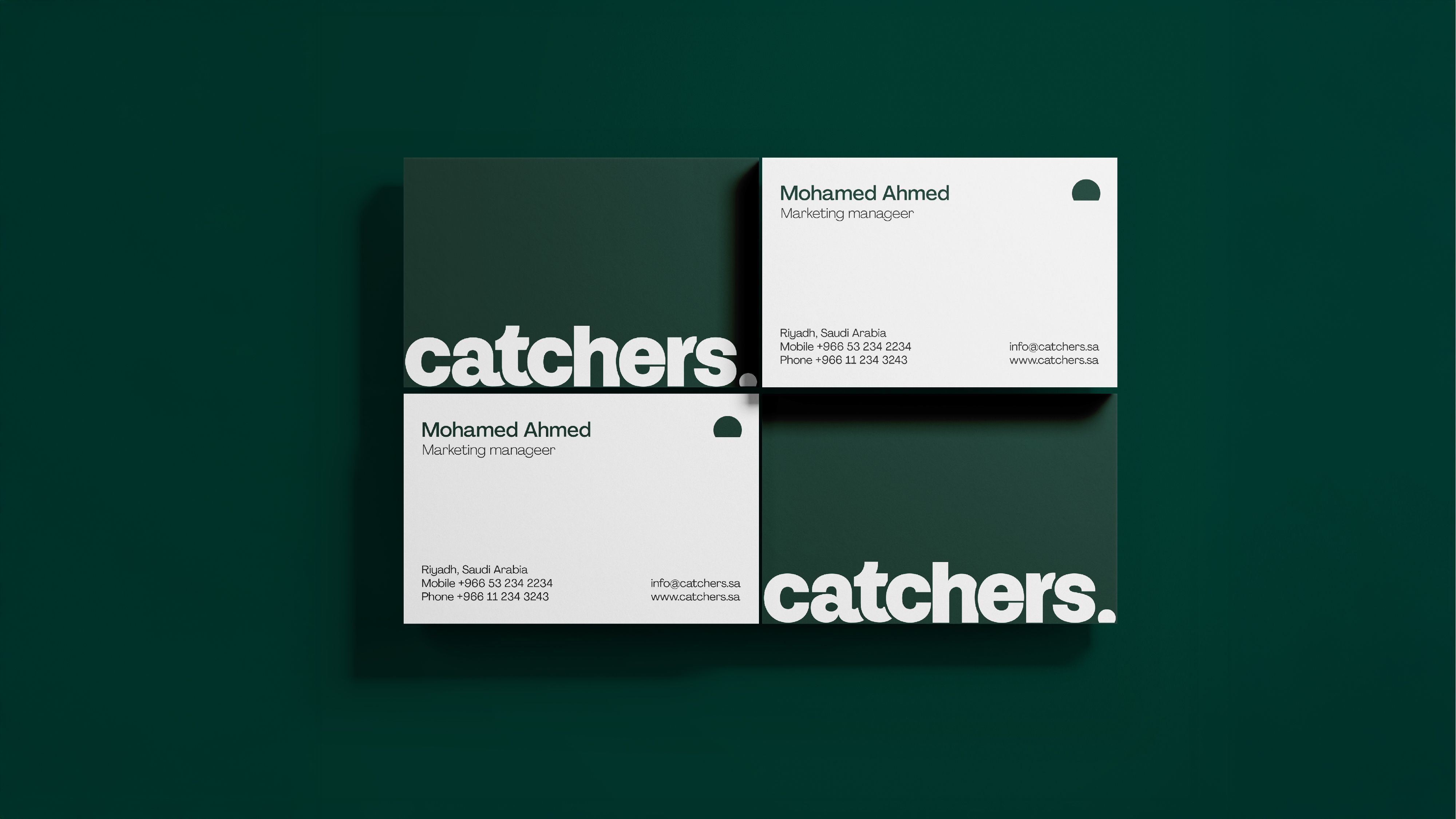 The logo for Catchers features a wordmark crafted in sans-serif typeface, notable for its sharp edges and an overlapping arrangement that results in a unique visual identity. This wordmark is complemented by an iconic dome-shaped symbol which not only acts as a period but also functions as a versatile graphic element, suitable for standalone use or for image masking purposes. The brand's color palette embraces green as the primary hue, supplemented by black, grey, and white, a choice that reflects its deep-rooted pride in its Saudi heritage.