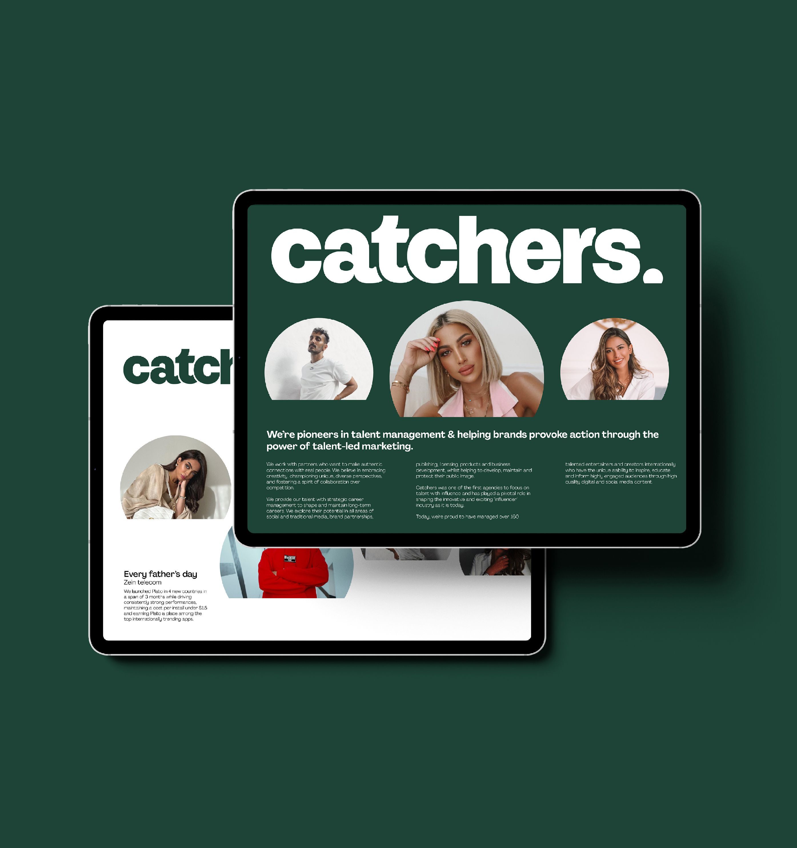 Catchers, rooted in Saudi Arabia, consists of a dynamic team of talent managers and agents deeply passionate about advancing the careers of influencers. Dedicated to transforming content creators' passion into a thriving profession, Catchers expertly facilitate connections between clients and influencers, ensuring precise audience engagement. This approach allows both parties to achieve their goals and attain the success they envision.