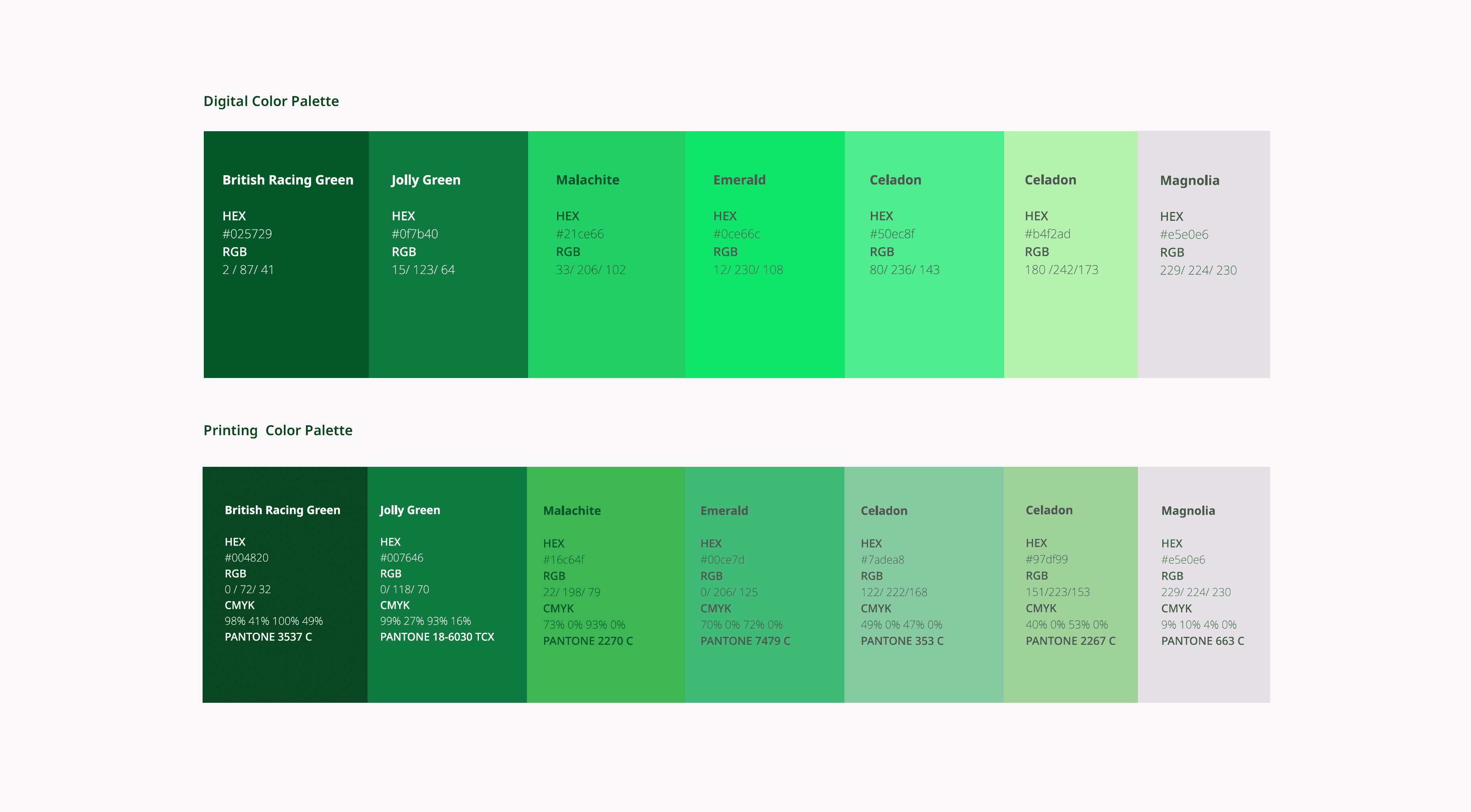 In the uplift exercise, the emblem was recreated using a grid structure to study the spacing and curvature of the emblem lines. The new design is flat and minimalistic, with no visual effects, which enhances its readability at all sizes and formats. This design also allows for flexibility in adapting color variations across different backgrounds. Additionally, some adjustments were made to the tone and shade of the green color.