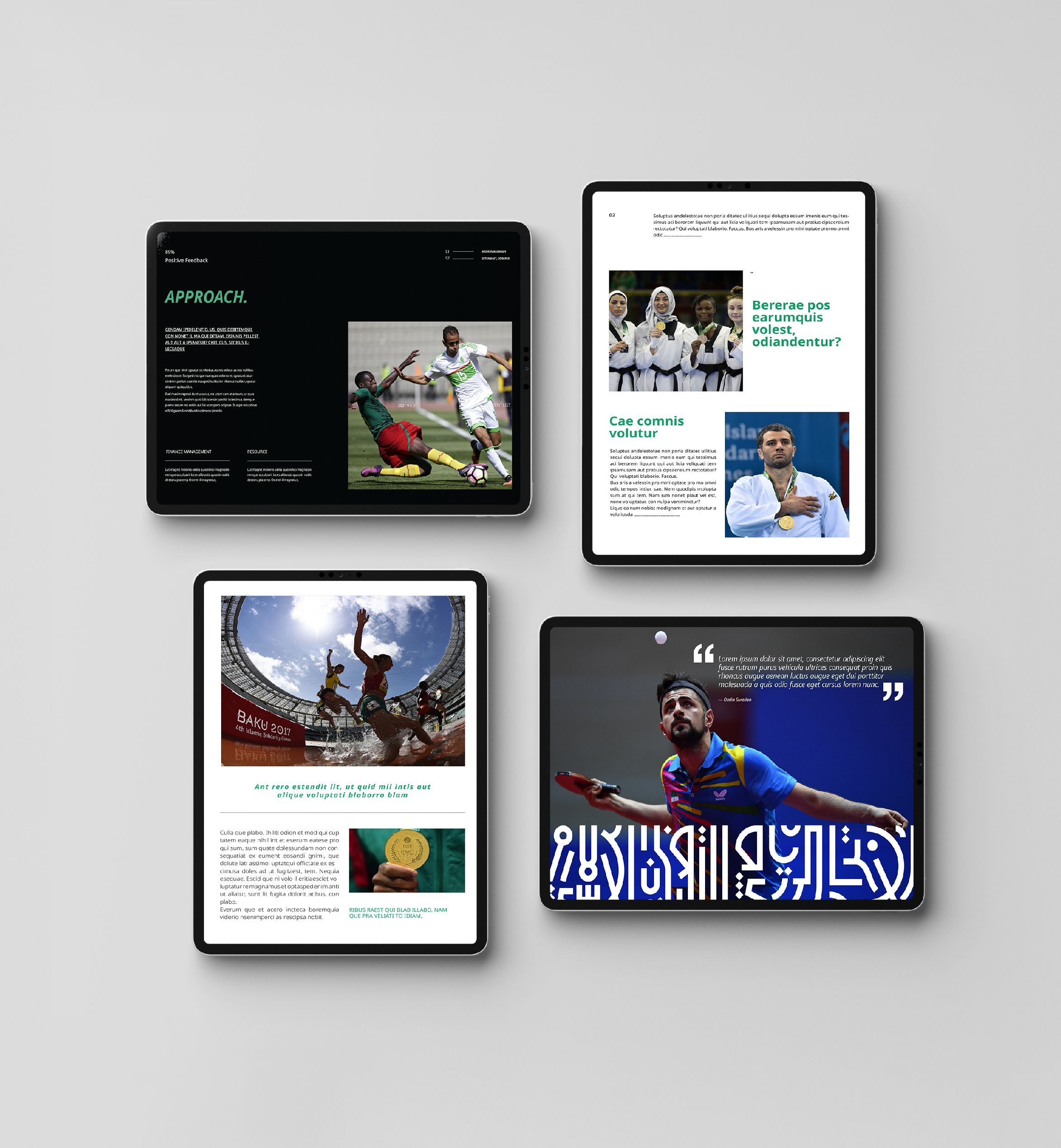 The brand's primary colors are green and white, symbolizing growth, balance, and purity, which reflect its values of strength and unity. In addition to these primary colors, the brand features an extended color palette that includes purple, yellow, blue, red, and pink. These vibrant accent colors enhance the brand's dynamism and passion, creating visual interest and evoking the excitement and diversity of the sports it represents.