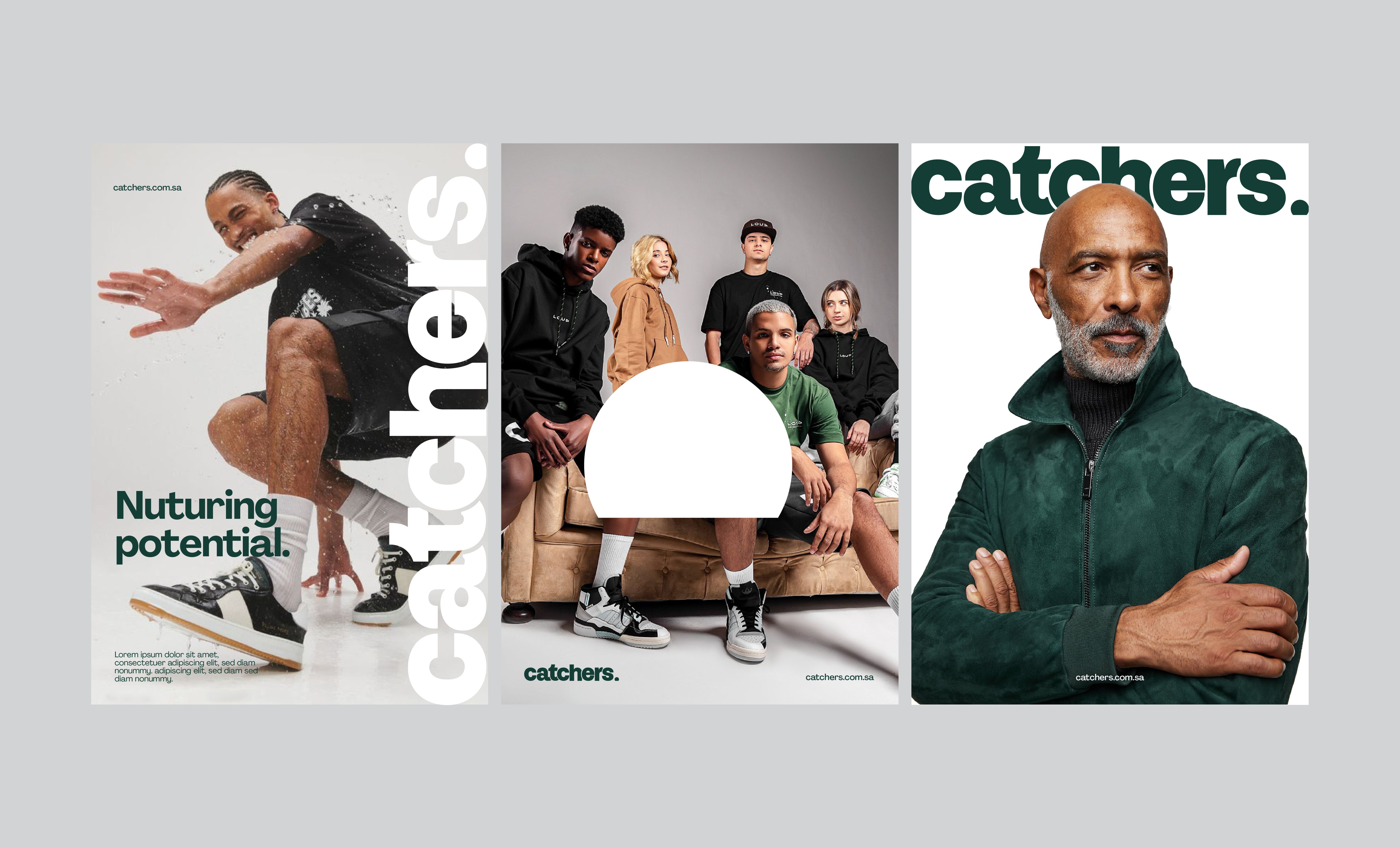 The logo for Catchers features a wordmark crafted in sans-serif typeface, notable for its sharp edges and an overlapping arrangement that results in a unique visual identity. This wordmark is complemented by an iconic dome-shaped symbol which not only acts as a period but also functions as a versatile graphic element, suitable for standalone use or for image masking purposes. The brand's color palette embraces green as the primary hue, supplemented by black, grey, and white, a choice that reflects its deep-rooted pride in its Saudi heritage.